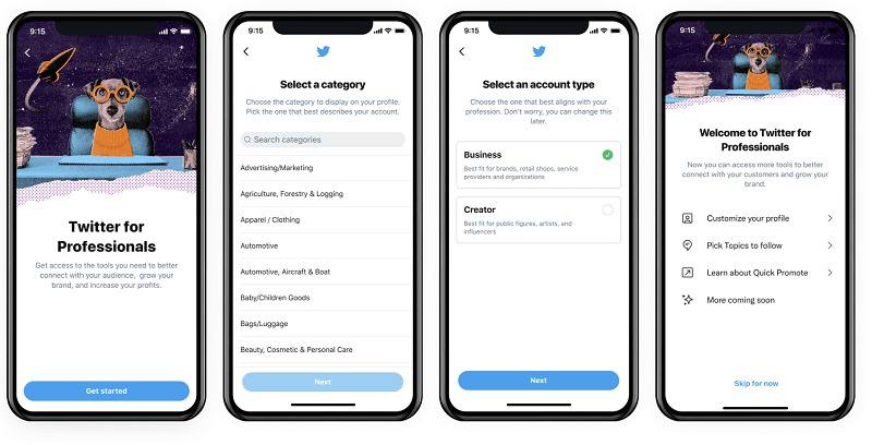 O Twitter está testando seus Perfis Profissionais desde abril , com marcas selecionadas participando do programa beta inicial. O Twitter então começou a convidar mais empresas para se inscreverem no início deste mês e agora está olhando para a próxima fase, com todos os profissionais e empresas agora capazes de se inscrever para as novas ferramentas de exibição.