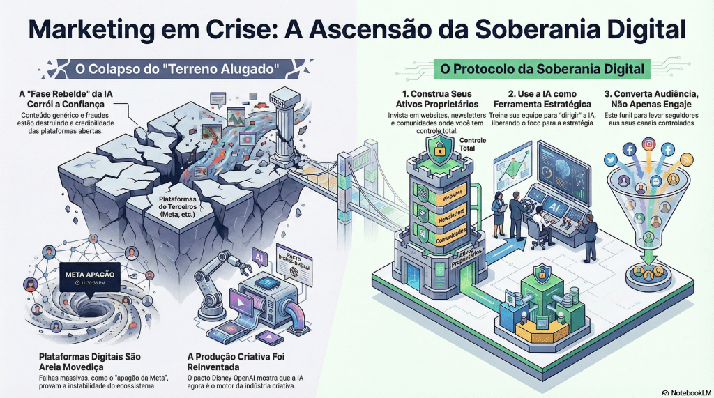 - Soberania Radical: Pare de alimentar exclusivamente o terreno alugado. Use as redes sociais apenas como funil. O destino final deve ser o SEU ecossistema (Site, Lista, Comunidade).